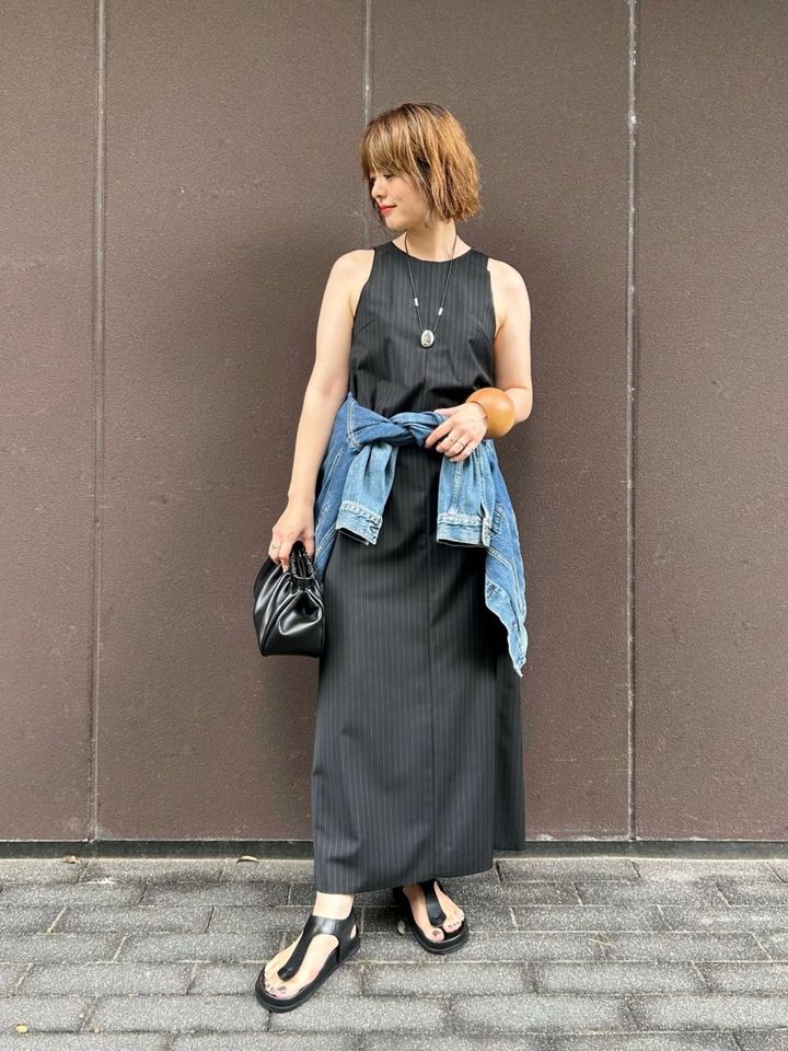 ハンサムなピンストドレスはカジュアル小物でこなれ感を。「ピンストライプのシャープな印象のドレスに合わせて、バッグやサンダルはシックでツヤ感のあるブラックで。デニムジャケットをウエストに巻き、こなれ感を演出してみました」