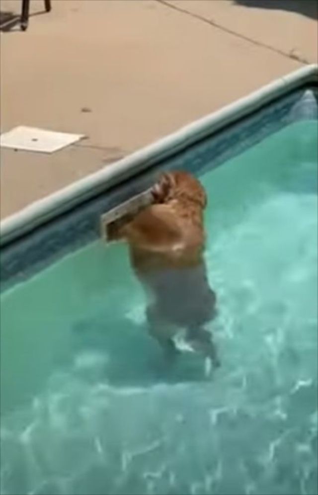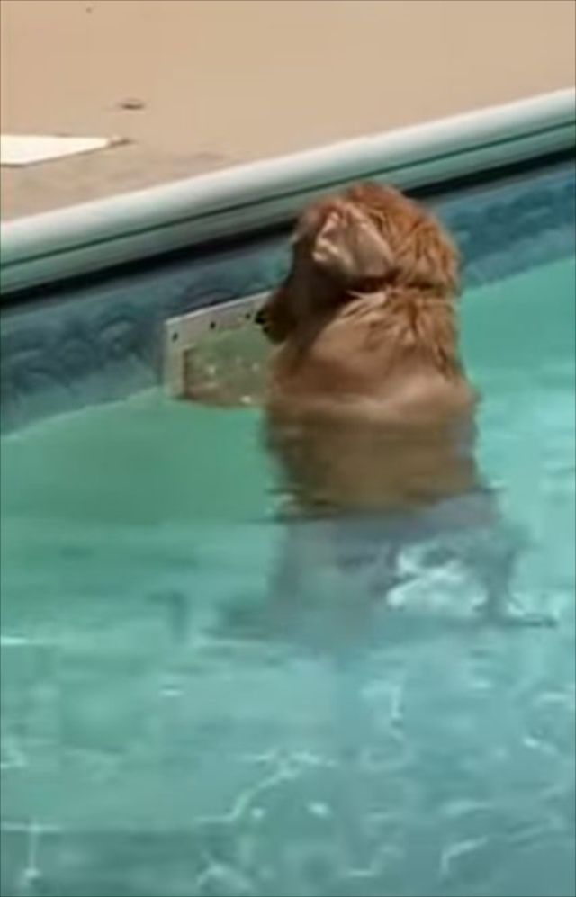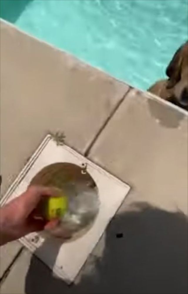 プールの排水溝に前脚を突っ込み、必死に何かを探している様子のワンコ。 一体何を探しているのでしょうか?