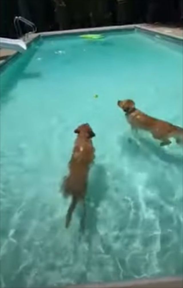 カイや他のワンコはテニスボールをめがけて、嬉しそうに泳いでいきます。 プールでテニスボールを使って楽しく遊んでいたのですね!