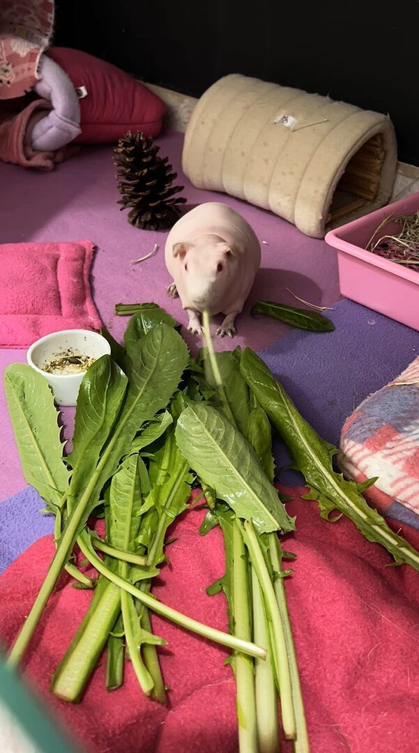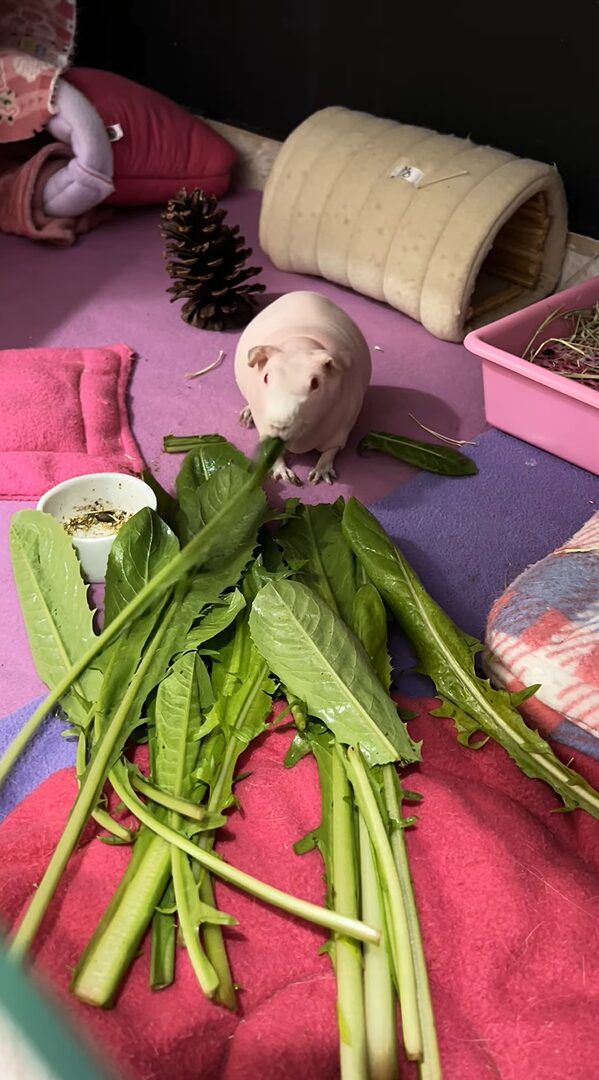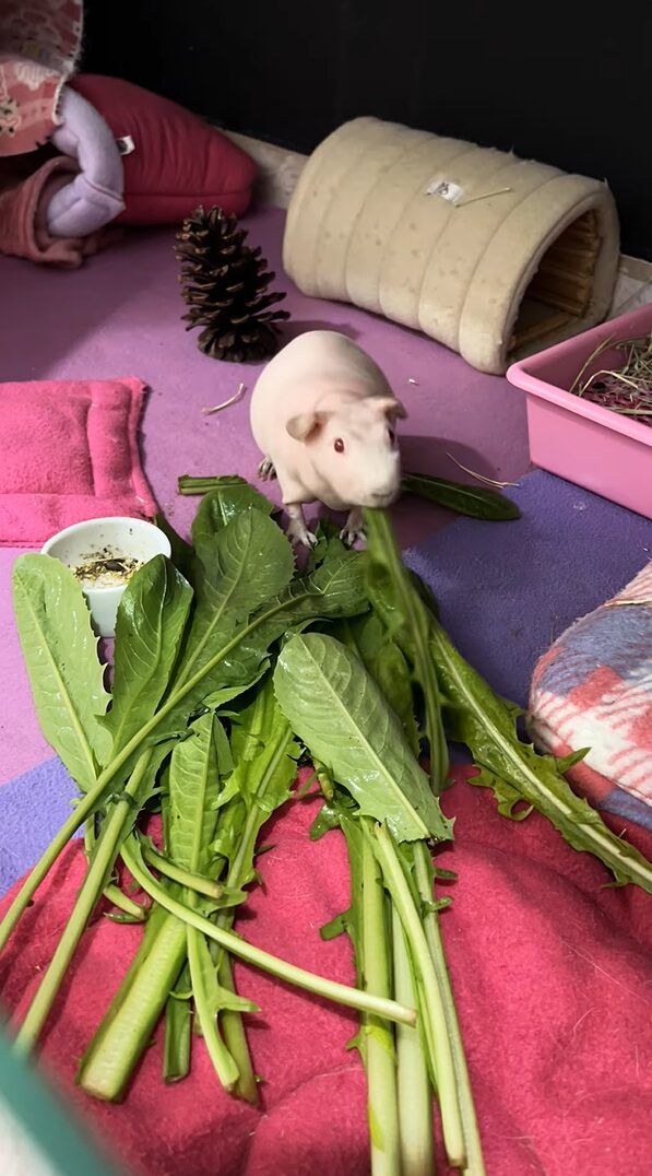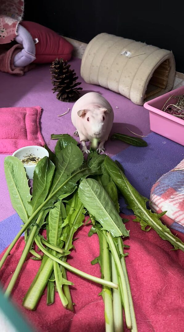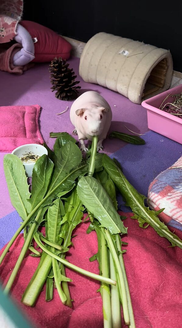 たくさんの葉っぱを食べるモルモット。 この子はよほどの食いしん坊なのでしょうか。