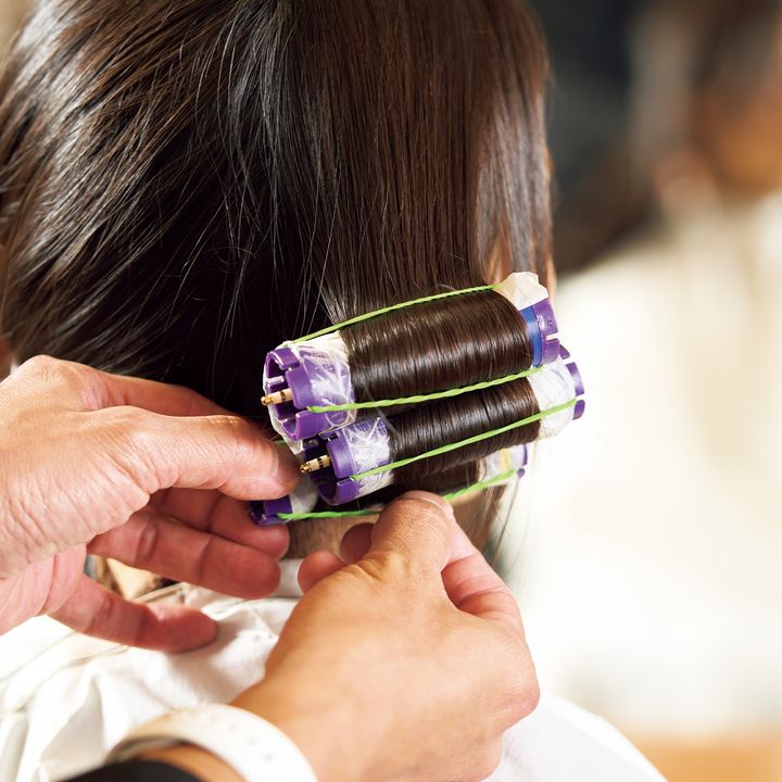 トップのストレート部分と裾のカールで華やかに。あご下から入れた平巻きパーマが肩でハネて、トップの毛がふんわり持ち上がるように計算。小雨で濡れてもカールをキープ!