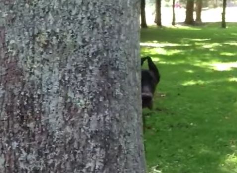 木の影からチラッ。恥ずかしがり屋の犬さん。