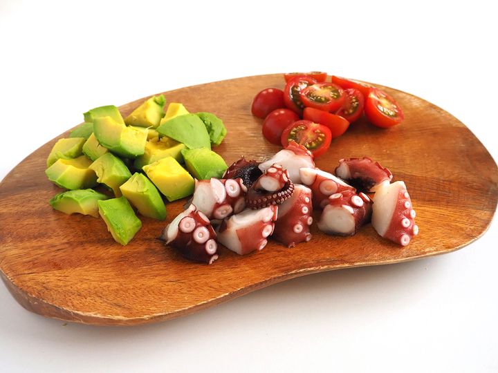 1. タコとアボカドは食べやすい大きさに切る。ミニトマトは半分に切る。