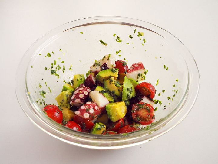 今回は、特別な道具は使用せず、ジェノベーゼにも劣らないバジルソースを作って、タコ、アボカド、ミニトマトを和えました。