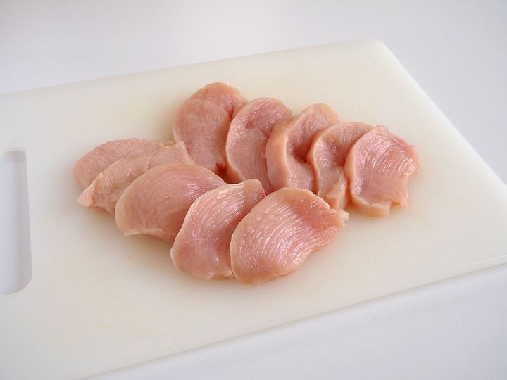 1. 鶏むね肉の皮は除き、食べやすい大きさに削ぎ切りにする。この時、厚みを1cmに揃える。