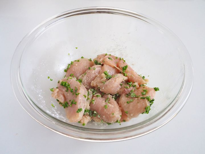 2. 鶏むね肉をボウルに入れ、Aを加えて揉み込む。さらに片栗粉を全体にまぶす。