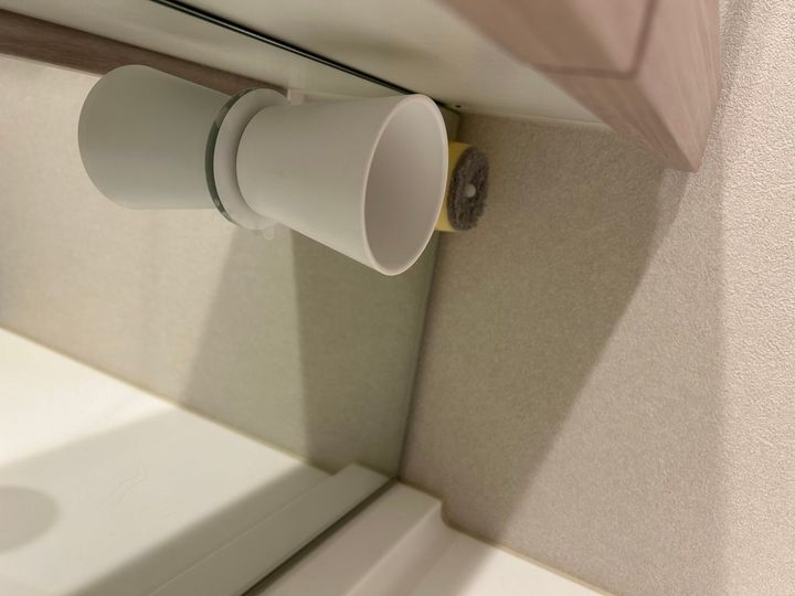 わが家は元々、珪藻土の上にコップを置いていたのですが、珪藻土を放置しておくとカビてくるんですよね(黒い点々がついてくる…)。濡らしたまま放置しないようにすれば掃除の頻度が減るかも?と思い、コップを洗面所から浮かして鏡につけるタイプにしました。これだけで珪藻土がそもそも不要になり、洗面所を拭くのも楽になりました!