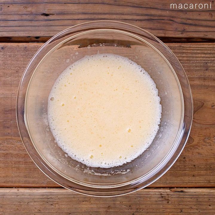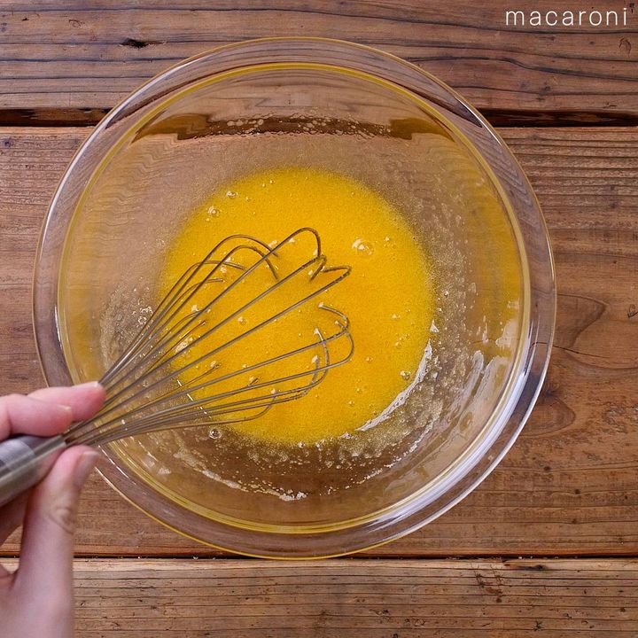 1: ボウルに卵、砂糖を入れて泡立て器で混ぜます。