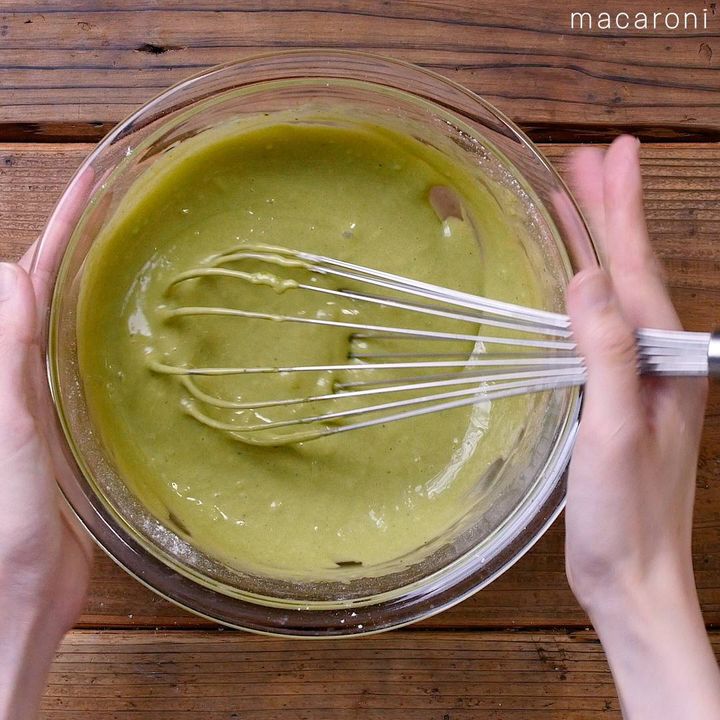 3: 薄力粉、ベーキングパウダー、抹茶をふるい入れ、粉気がなくなるまで混ぜます。