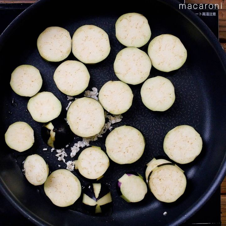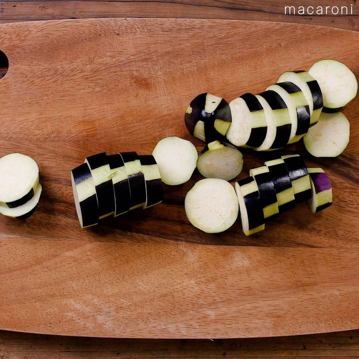 1: なすはヘタを切り落としてピーラーでまだらに皮をむき、1cm幅の輪切りにします。