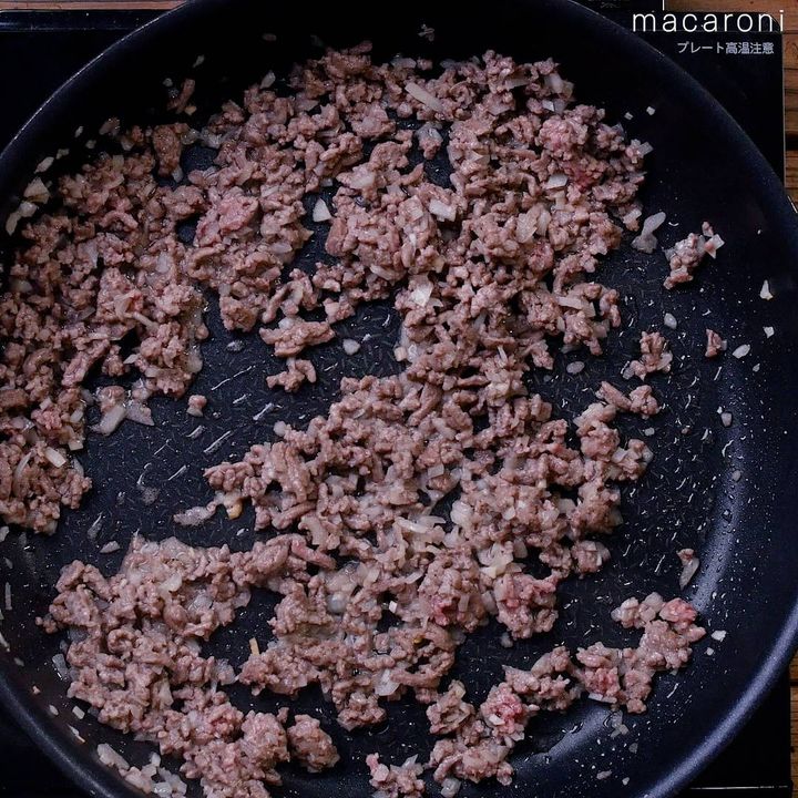 3: 両面焼き色がついたらなすを取り出し、合い挽き肉、玉ねぎを加えて炒めます。