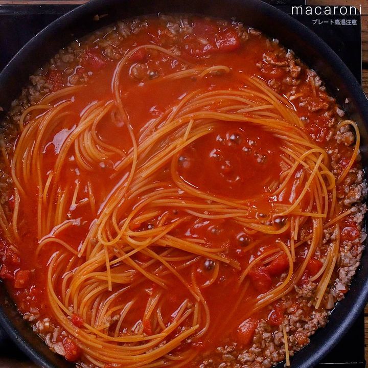 5: パスタを加えてフタをし、袋の表記時間通りに弱中火で煮込みます。※途中でフタを開けて何回かほぐすようにすると、くっつきにくくなりますよ。