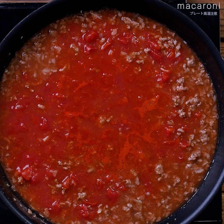 4: 火が通ったらカットトマト缶、水、塩、コンソメ、ケチャップを加えてひと煮立ちさせます。