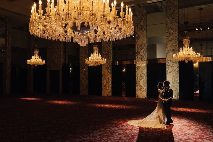 ホテルのメインバンケット「ボールルーム」。約10mという天井高からきらめきを放つのはフランス・バカラ社製のシャンデリアです。壮麗なインテリアを舞台に、ドラマチックな撮影が叶います。