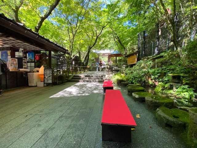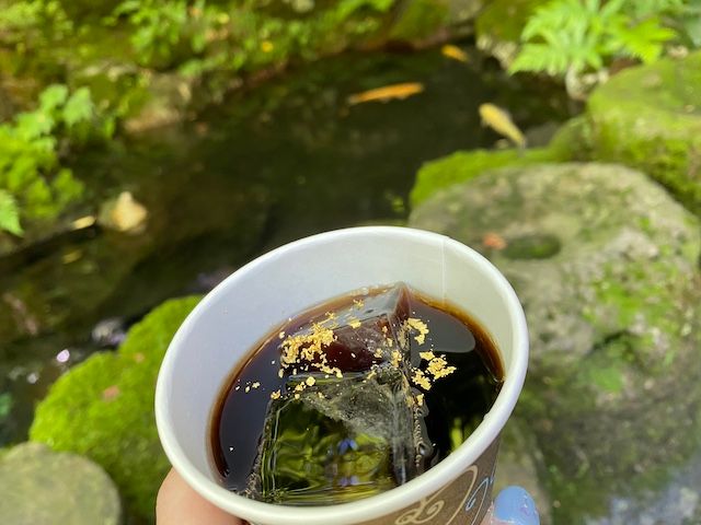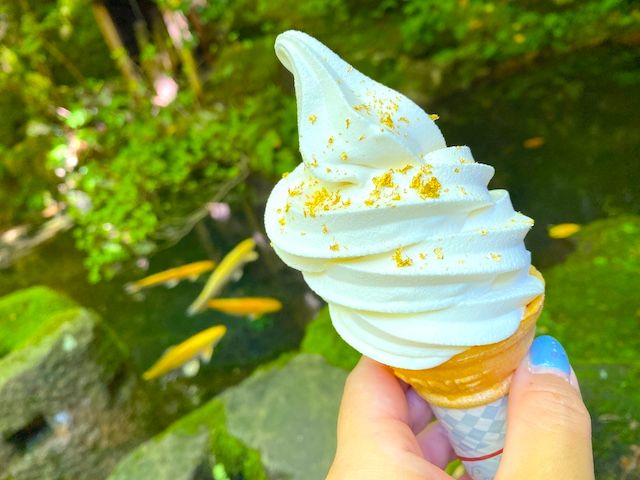 筆者は資料館を出た先の売店の隣にあった「中庭カフェ」で休憩しました。金色の鯉が池で泳ぎ、金箔ソフトクリームや金箔コーヒーで一休みできる、憩いの黄金空間です。