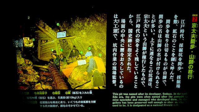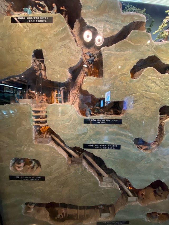 坑道内には65体の人形(ロボット)が配置され、当時の様子が再現されています。パネルでわかりやすく役割や作業の様子を説明してくれているので、ここでもつい説明を読み耽ってしまいます。坑道は間歩(まぶ)と呼ばれていたそうです。