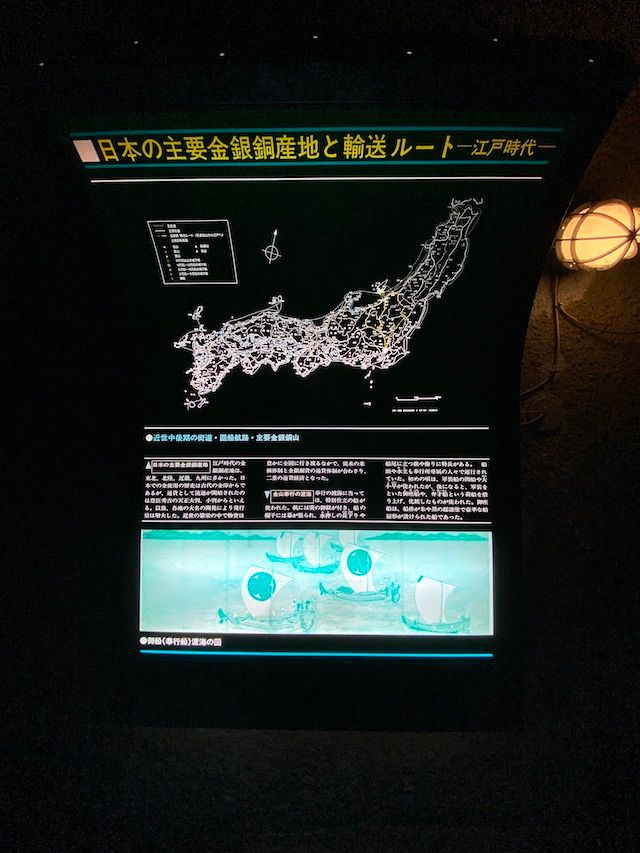 暗いトンネルの壁に、金銀銅の産出量と歴史年表、様々な大判・小判、金山の組織一覧表など興味深い展示がたくさん並んでいます。全部じっくり読んでいたらきっと30分ではまわれないだろうなあと思いつつ、ついつい面白くて読み込んでしまう。