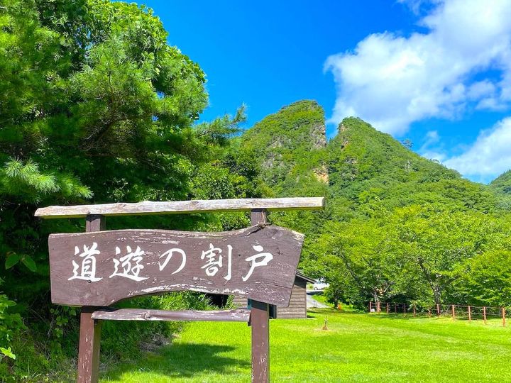 機械工場まで戻り、看板のある広場から道遊の割戸を眺めると、また違った絶景に見えます。この看板が入るように撮影するのもおすすめです。