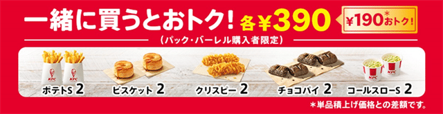 「観戦バーレル」を購入すると「ポテト(S)」2個、「ビスケット」2個、「カーネルクリスピー」2ピース、「チョコパイ」2個、または「コールスロー(S)」2個をそれぞれ390円でいくつでも注文可能になります。