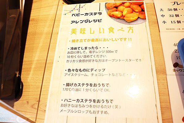 レジ前には、「美味しい食べ方」の説明書きが! すぐに食べきれなくて冷めてしまったとか、家族にお土産に買って帰ろうという時に、温め方を教えてもらえるのは嬉しいですよね。 個人的にはカリカリ食感のベビーカステラも好きなので、次回購入時はトースターで温めてみようかなと思います。 今からの季節にはアイスにディップも美味しそうだし、揚げカステラも気になる… これはリピ確定ですね!