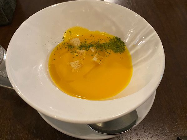 スープは南瓜のスープです。温度がちょうどよく出てきました。ランチでこんな気配りをしていただけるとは感動しました。