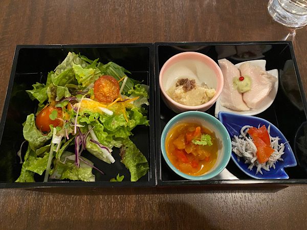お重の1段目はサラダです。イタリアンでこのサラダの量は嬉しいです。 2段目はアラカルトでした。 蒸し鶏やジャコなど和風テイストなお料理もあり、一つずつ器に入っているので味が移ることなく楽しめました。