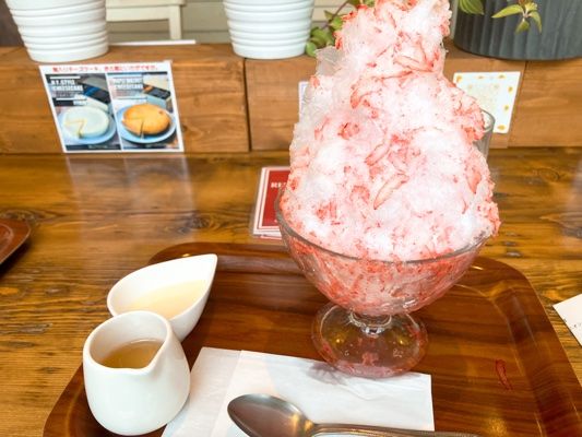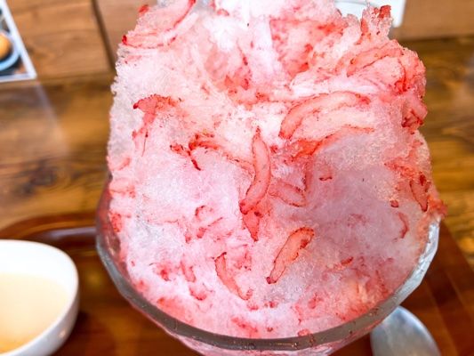 練乳と黒糖シロップ二つの味が楽しめます。かき氷外食でいただくの、初めてなのですが、ふわふわで、すぐとろけます。おいしいです!暑い日だったので、ペロリとたいらげちゃいました。イチゴスライスがいい感じ。
