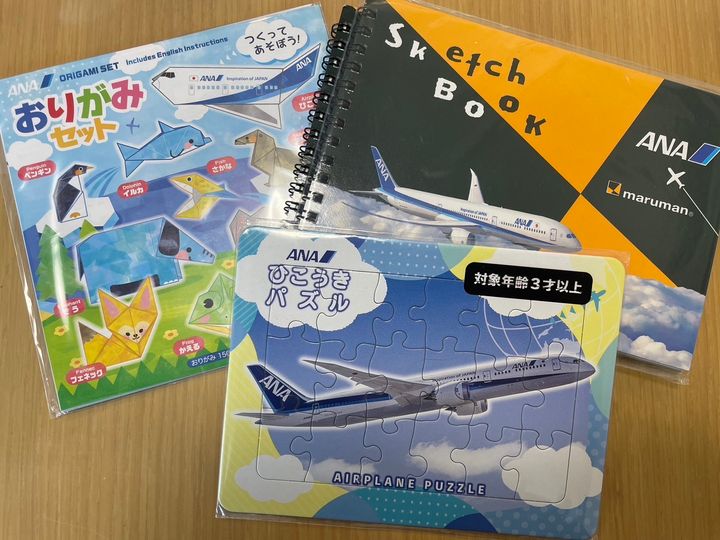 機内では、子供用に折り紙やスケッチブックなどをいただきました