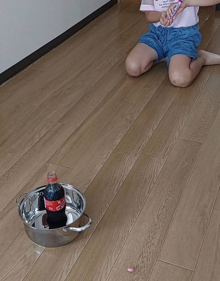 コーラのペットボトルの口の中に入るよう、メントスを投げるゲームです。