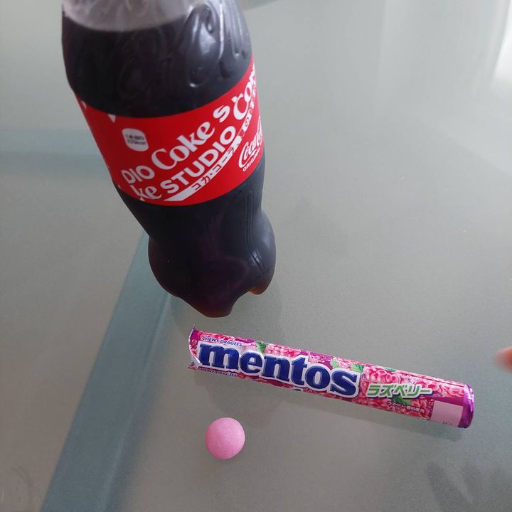 コーラの中にメントスが入るとコーラがあふれ出てくるので、それも楽しいポイント。