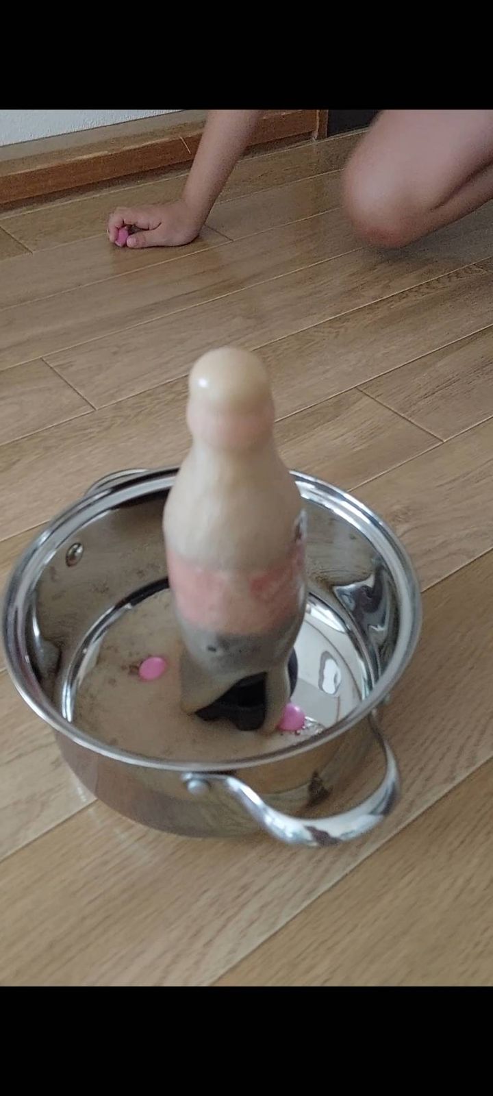 大きなお鍋にコーラを置き、メントスを投げてみましたがこれがまあ入りません(笑)