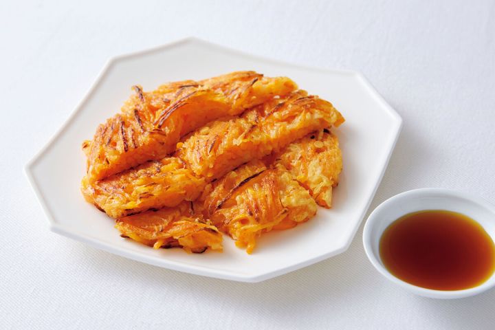 表面は香ばしくカリッカリ! せん切りにしたにんじんの、小気味良い食感が楽しめる一品です。