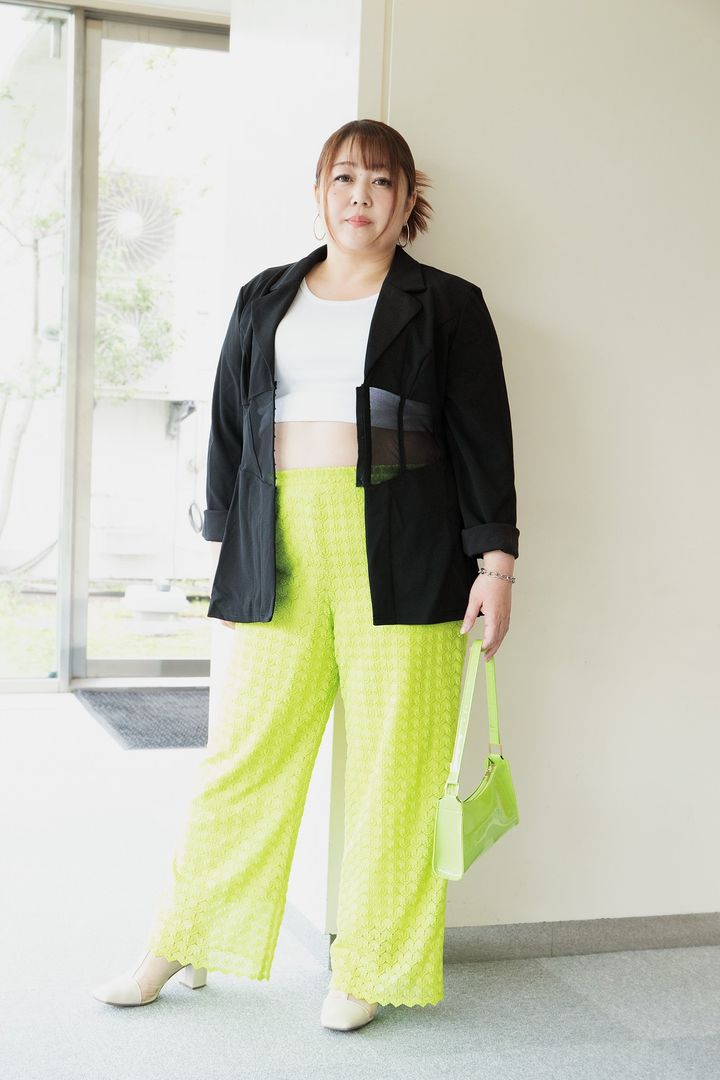 テーマはクールカジュアル。パンツ&バッグの色を合わせました。クロップドトップスにウエストが透けたジャケットを重ねて、ヘルシーでかっこいい肌見せに。