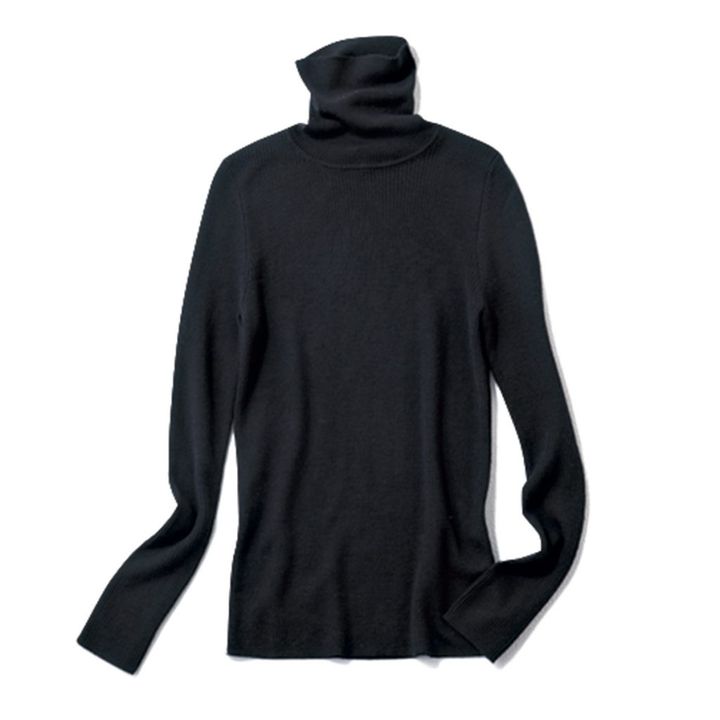 コーディネートに奥行きが生まれるだけじゃなく、暖かいのもうれしい薄手の黒のタートルネックニット。¥2,990(UNIQLO)