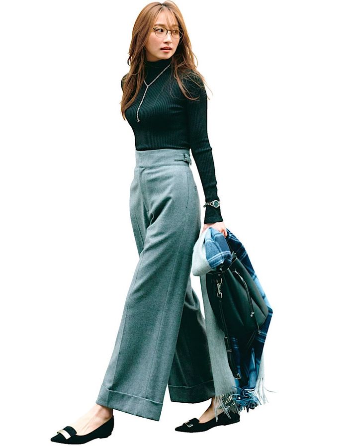 1月19日(木)、黒のタートルニット×グレーのワイドパンツという、ベーシックな通勤コーデには、胸元のアクセサリーを忘れずに。このひと手間のおかげで、一見シンプルなスタイルが、グッとオシャレな印象に変わります。考えなくてもキマる時短コーデは、忙しい朝にひと役買ってくれるはず。
