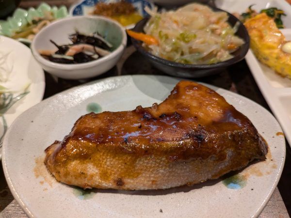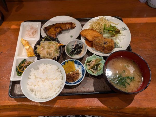 素晴らしいです。お盆にギリギリ乗っているおかずです。これは凄い!メインが天然ブリの照り焼き・ササミかつ・茄子のはさみ揚げです。小鉢が6品と漬物・お味噌汁・ご飯付きです。