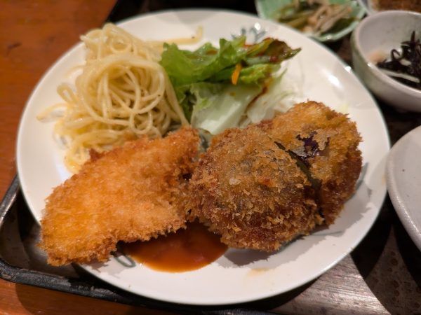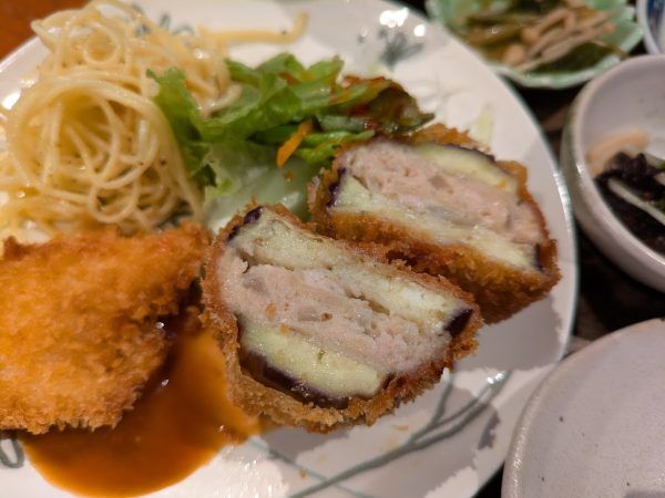 サクサクのキレイに揚がった茄子のはさみ揚げとササミかつです。