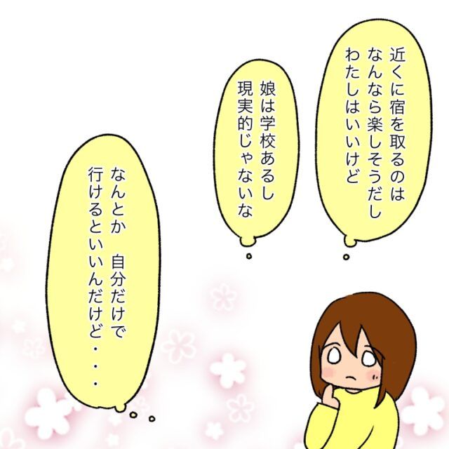 近くに宿を取るのはなんなら楽しそうだし私はいいけど、娘は学校あるし現実的じゃないな。
