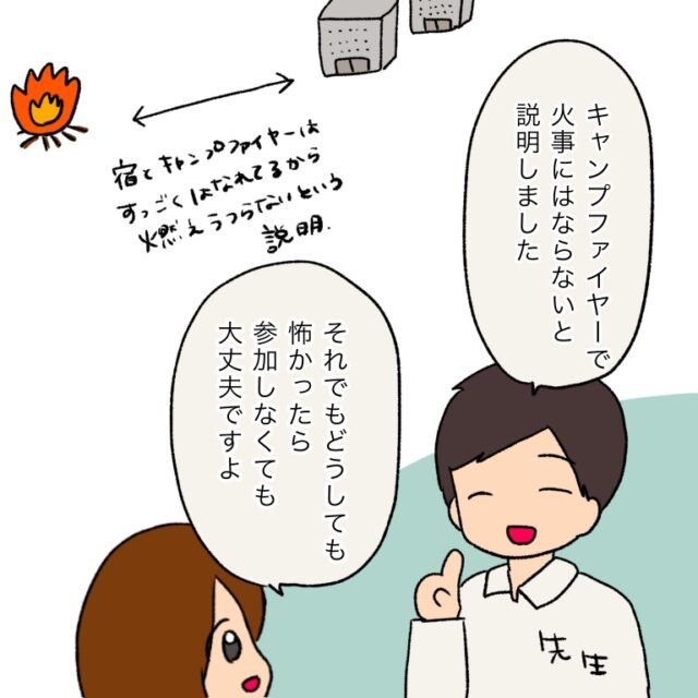 「キャンプファイヤーで火事にはならないと説明しました。それでもどうしても怖かったら参加しなくても大丈夫ですよ」
