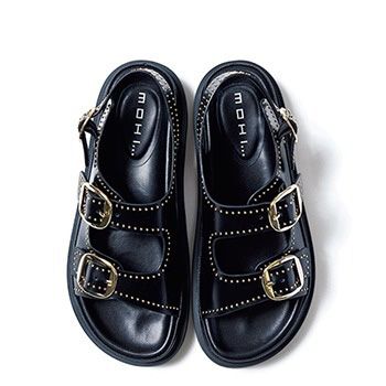 黒スタッズつきサンダル(3) /モヒ(レイビームス 新宿) 黒レザーに好相性なスタッズ。小さく細かく配することで悪目立ちもなく、黒レザーの緊張感を和らげるちょうどいいアクセントに。