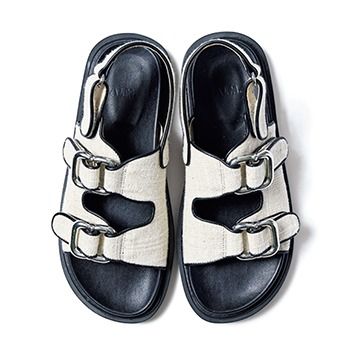 今季は、ヒールバンドがあるかかとが抜けないダブルバックルサンダルが豊富。特徴は、パタパタせず歩きやすい厚めのソールに、ハンパな丈やワイドなすそともバランスがとれるボリュームフォルム。おかげでスニーカーよりも軽快かつノンストレスで季節感を得た装いが可能に。メンズ感が出すぎないよう、やわらかさや女性らしさを備えた素材のなかでセレクト。