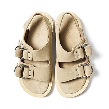 ベージュスエードサンダル(2.5) /カミナンド(グラビテート) ダブルバックルの無骨さをほどよく落ち着かせるやさしい色のスエード素材。起毛感のある風合いも面積を抑えれば適度なぬくもりを加えるアクセントにとどまる。