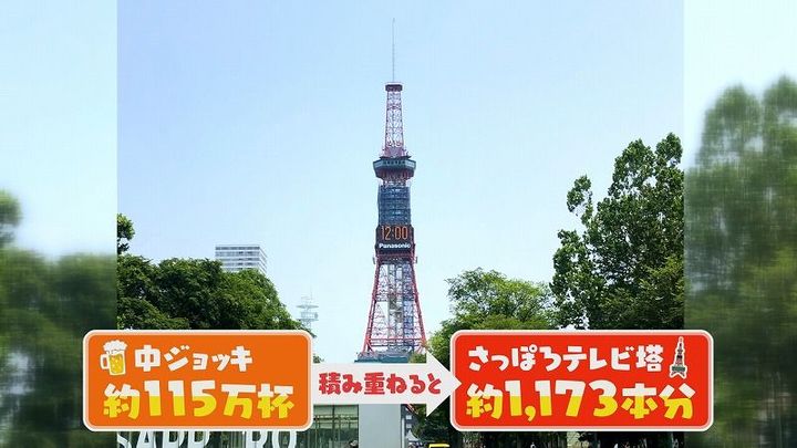 その中ジョッキ(15㎝)を積み重ねると、さっぽろテレビ塔(147.2m)、およそ1,170本分にもなります。