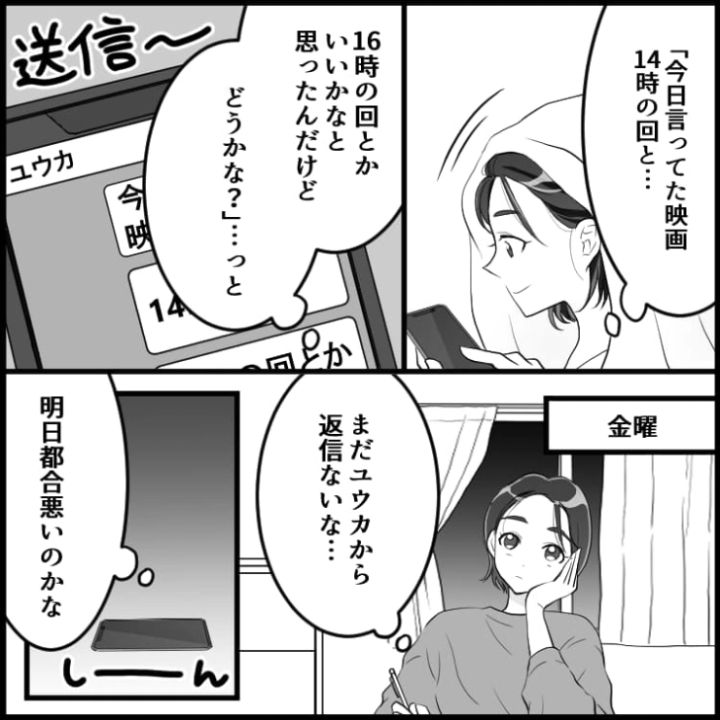 友達と映画を観る約束をした主人公。詳細を決めようとメッセージを送っている様子。