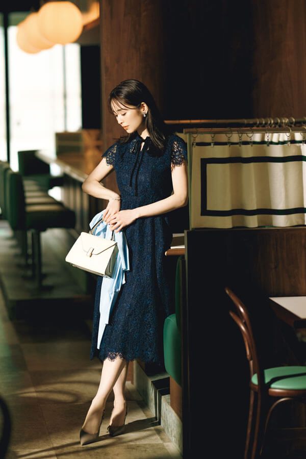 クラッシーな濃紺のレースが淑女な雰囲気。首元のベロアリボンがリュクスなポイントに。上質なレザー小物でワンピースをさらに高見えさせて。