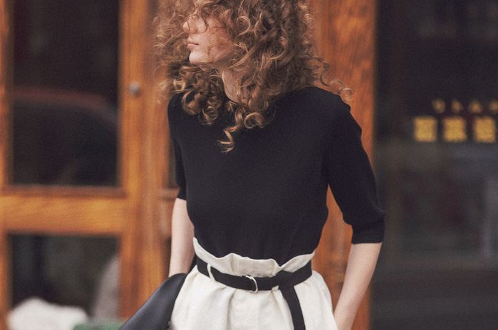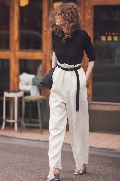 メンズサイズのような、余裕のある腰回りを「ベルトありきで」キュッと絞って穿くワイドパンツ。対してすそはやや細いテーパードシルエットにすることで、ヒップラインを拾わずに、程よい丸みを演出。合わせるトップスは、コンパクトな形か短め丈を。自然にウエストの位置も上がるから、ローヒールやぺたんこ靴でもバランスよく仕上がる。