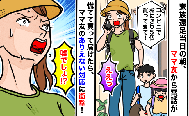 家族遠足イベントの朝のことです。出かける直前、知り合いのママ友から電話があり…。