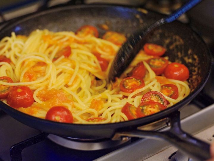 堅めにゆでたパスタを加えたら、パスタに火を通しながらトマトのうまみをぎゅっと吸わせて。プチトマトも最後に炒め、甘みを引き立たせます。