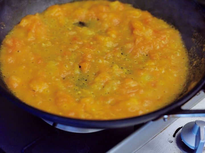 にんにくの香りをうつしたオリーブオイルでトマトを炒め、しっかり煮つめることがポイント。ここでトマトのうまみを凝縮させます。