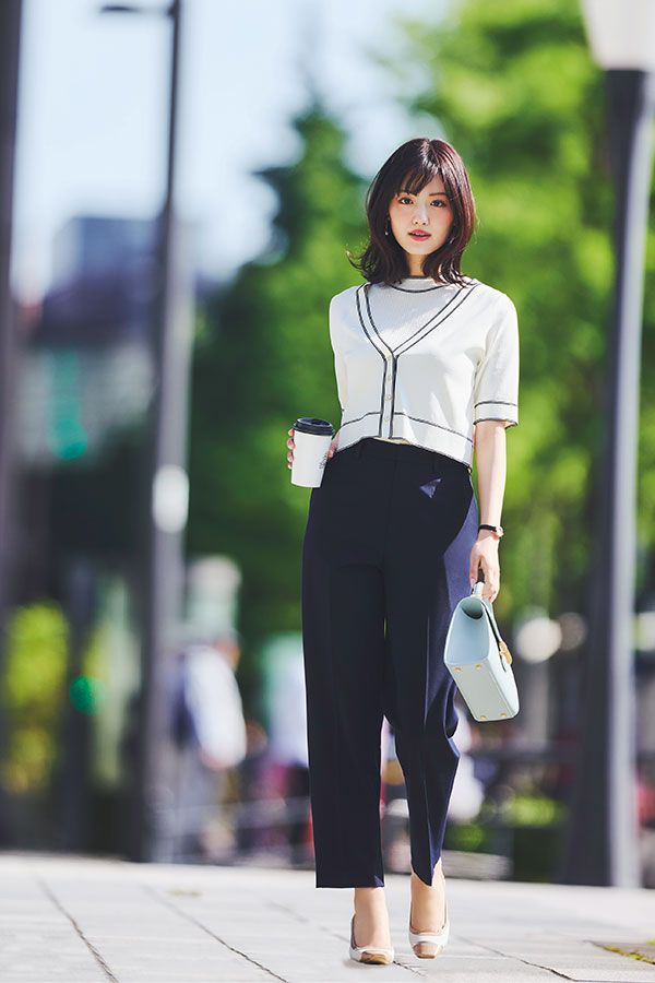 スタンダードなネイビーの通勤パンツスタイルに、パイピング入りのクロップトカーデで今年らしい表情を加えて。